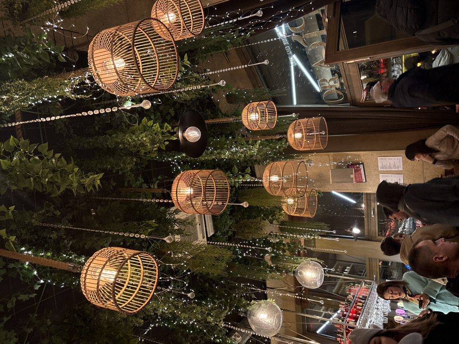n outdoor dining area illuminated by a series of decorative lights. Some lights are enclosed in wicker-style cages, while others are clear orbs. Strings of beads and tiny fairy lights are interspersed among greenery. People are visible, some seated at tables, others standing. A bar area with glasses and bottles is partially visible in the background. The scene appears to be taken at night, creating a warm and inviting atmosphere.