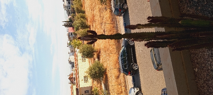 The image depicts an elevated view of a residential and undeveloped area within Ain Chkef, Morocco, under a clear sky with scattered clouds. In the immediate foreground, a tall, multi-stemmed cactus plant with dark green and reddish-brown segments rises from a bed of light-colored gravel, partially obscuring the right side of the frame. A grey concrete barrier is visible at the bottom. Beyond the barrier, a paved asphalt road with a blue-painted curb runs horizontally across the midground. Three vehicles are parked along this curb: a silver SUV is partially visible on the far left, a dark-colored SUV (likely black) is centrally parked, and a dark grey compact SUV is positioned further right. Behind the road lies a large expanse of dry, yellowish-brown vegetation and bare ground, indicative of a field or undeveloped plot. This area contains several scattered green trees and shrubs, and a wire fence can be observed in sections. In the background, various residential buildings are visible: a light-colored building with a terracotta-tiled roof and another structure with a patterned yellow facade appear on the left, bordering the dry field. Further back, a cluster of multi-story residential buildings, varying in color and style (white, grey, light pink), form a denser urban backdrop. The horizon reveals faint outlines of distant hills or mountains beneath the blue sky. No individuals are visible.