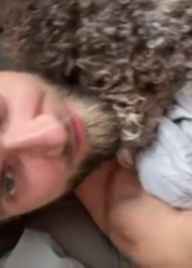 A man with light brown hair and a beard is lying on his back on a bed