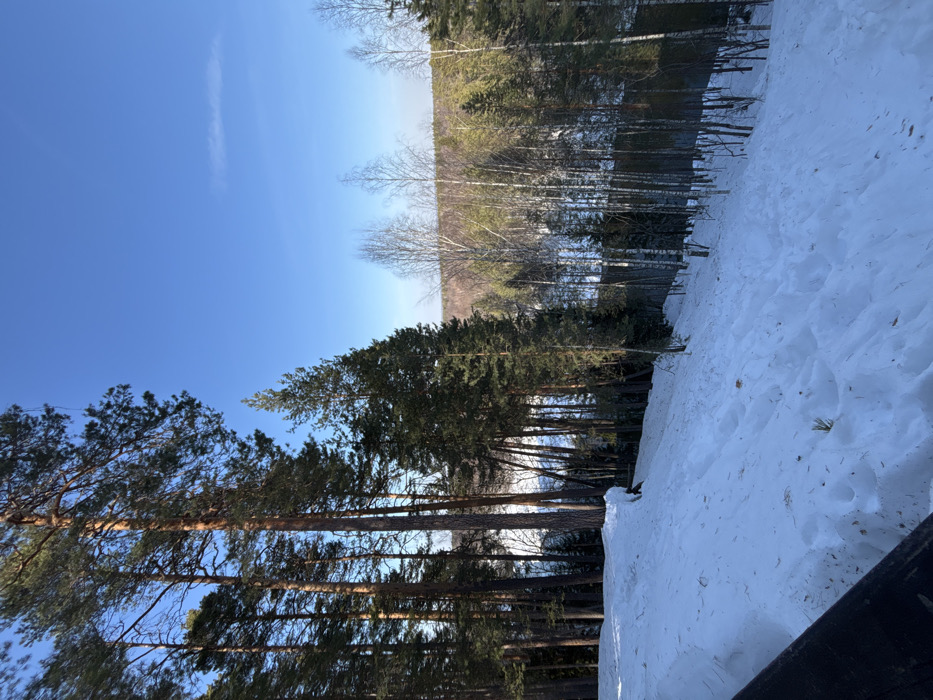 This image depicts a snow-covered winter landscape in Klenovaya Gora, Russia, under a clear blue sky. The scene is observed from an elevated position, looking down a gentle slope blanketed in white snow. A dark, horizontal railing or wooden structure is partially visible in the bottom-left corner of the foreground. Footprints and disturbed snow are present on the slope, which descends towards a dense mixed forest in the midground. The forest comprises numerous tall trees, primarily dark green conifers (pines) on the left, with their trunks illuminated by direct sunlight, casting shadows across the snow. To the right, deciduous trees with pale, bare trunks (likely birches) are interspersed among the evergreens. Through the trees in the mid-distance, a lighter, possibly snow-covered area, which could be a frozen body of water or a clearing, is visible. The background consists of a distant treeline beneath a uniformly clear, bright blue sky with a faint wisp of cloud in the upper right quadrant. No individuals or discernible actions are present in the scene.
