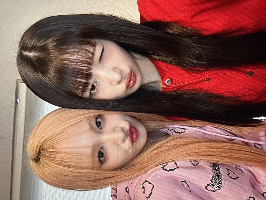 Two young adult females are depicted in a close-up indoor portrait, likely a selfie. The precise location within Seoul, South Korea, is not discernible; the background consists of a plain, light-colored wall. The subject on the left has long, straight, light orange-blonde hair with bangs and wears a light pink hooded sweatshirt patterned with black, stylized heart graphics, one partially displaying "Heart Break" text. Her eyes are open, looking directly at the camera, and her lips are pursed with red lip gloss. The subject on the right has long, straight, dark brown hair with blunt bangs and wears a red V-neck cardigan with light-colored buttons. Her right eye is winking, her left eye is open, and her lips are also pursed with red lip gloss. Both individuals exhibit similar playful facial expressions, suggesting an informal pose for the photograph.