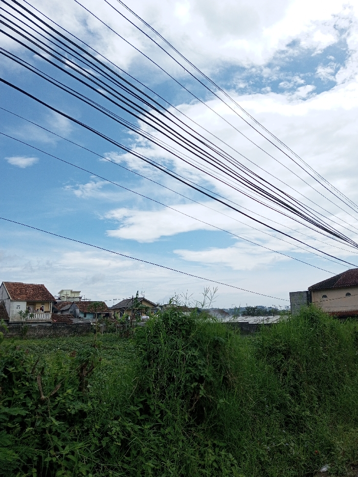 The image displays an outdoor, semi-urban scene in Ariyalai, Sri Lanka, under a partly cloudy sky. The upper third of the frame features a blue sky with scattered white cumulus clouds, intersected diagonally by approximately twelve parallel dark utility wires extending from the upper left to the upper right. The midground reveals a residential area consisting of multiple buildings with reddish-brown tiled roofs. On the left, a light-colored house with a small balcony and a tiled roof is visible. Other houses, varying in design and color, recede into the distance, with one partially visible beige building and a tiled roof on the far right. The foreground is dominated by dense, unkempt green vegetation, including tall grasses and various leafy plants, occupying the lower two-thirds of the image. No individuals, animals, or specific actions are present in the scene.