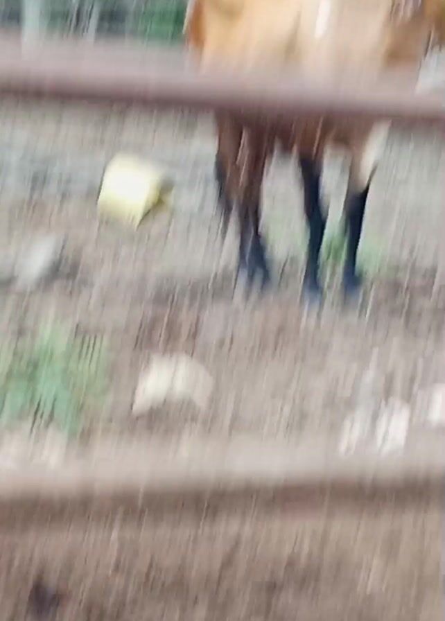 thin, brown cow standing in a muddy pen. The cow is behind a rusty, brown pipe fence. The background consists of green foliage and a wire fence. A yellow bucket and some rocks are also visible on the ground. The cow is facing to the right of the frame.