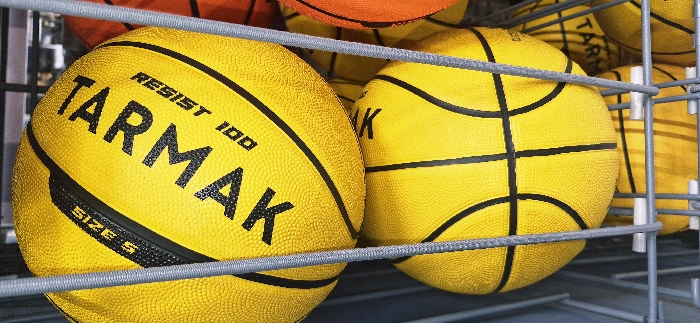 - "Several yellow "Tarmak Resist 100" basketballs, size 5, are contained within a gray metal wire rack" by FM-uLzcF2, licensed under CC BY 4.0