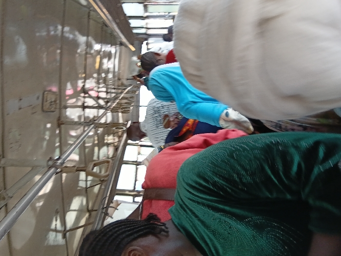 The image displays the interior of a crowded public transport vehicle, specifically a bus, located in Shangisha, Nigeria