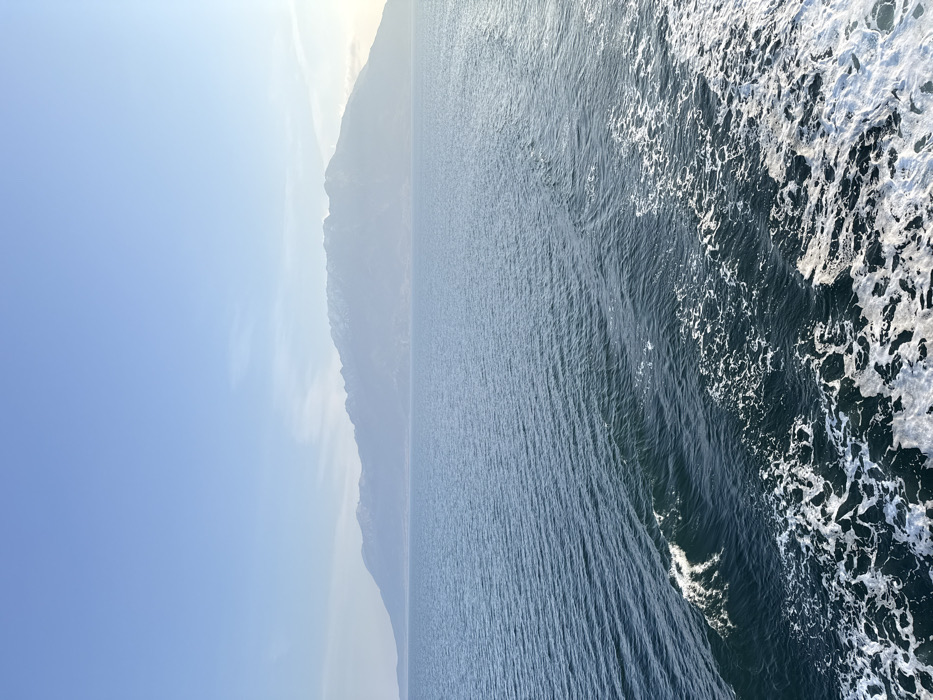 The image displays an expansive maritime and mountainous landscape observed from a moving vessel near Palaiopoli, Greece