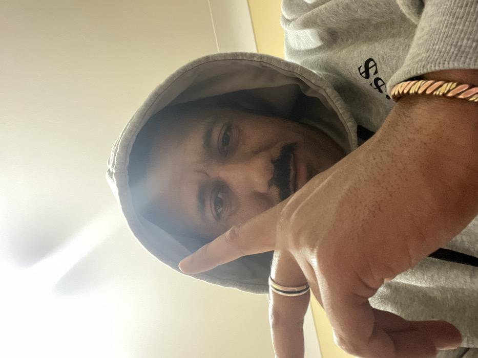A man with a mustache peers down at the camera, wearing a grey hooded sweatshirt. His right hand is extended, index finger pointing towards the viewer, adorned with a silver ring. A copper bracelet is visible on his right wrist. The background is a muted, slightly lit ceiling. The overall angle is a low-angle shot.