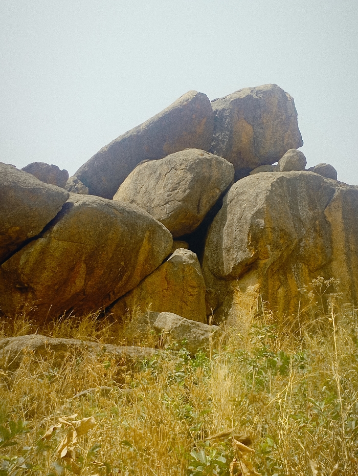 The image displays a large natural rock formation situated in Vom, Nigeria. A substantial aggregation of weathered, grey-brown to ochre-colored boulders dominates the upper two-thirds of the vertical frame, exhibiting irregular stacking patterns. The individual rocks possess varying sizes, with both rounded and angular contours, and some display visible fissures on their surfaces. The lower third of the scene consists of ground-level vegetation, primarily dry, golden-brown grass, interspersed with scattered clumps of green, leafy shrubs and taller, sparse plant stalks. The sky above the rock formation is a uniform, light grey, indicating bright, diffused ambient light. No individuals, animals, or man-made structures are visible.