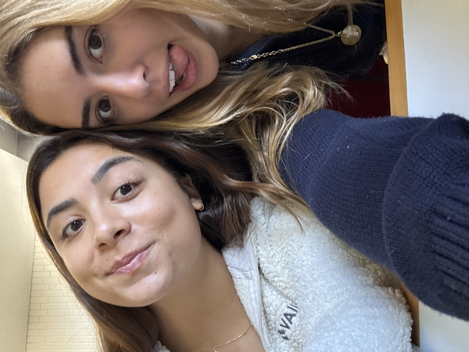 The image displays a close-up selfie of two young adult females, likely taken indoors
