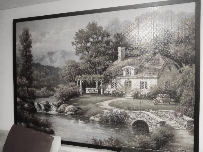 A large, rectangular, framed jigsaw puzzle is mounted on a light-colored wall within a structure located in Lomas de Zamora, Argentina. The puzzle displays a monochromatic landscape scene primarily in grayscale or sepia tones, composed of numerous visible pieces. The central subject is a two-story rustic cottage featuring a thatched roof, a prominent chimney, and multiple windows with cross-hatched mullions. A winding path, made of stone or gravel, originates from a small, arched stone bridge and leads to the cottage's front door. The bridge spans a river or stream that flows from the left foreground towards the right, exhibiting minor cascades over rocks on the left side. Several white waterfowl, identified as swans or ducks, are present in the water. To the immediate left of the cottage, a white garden swing is suspended beneath a trellis structure. A wooden wheelbarrow is positioned on the ground to the right of the cottage, near the path. The scene is framed by dense trees and varied foliage, with distant mountains or hills visible in the background under an overcast sky. The entire puzzle is enclosed within a dark, likely black, frame. A portion of a dark brown pillow rests on a light-colored couch, visible in the lower left foreground, partially obscuring the bottom edge of the framed puzzle.