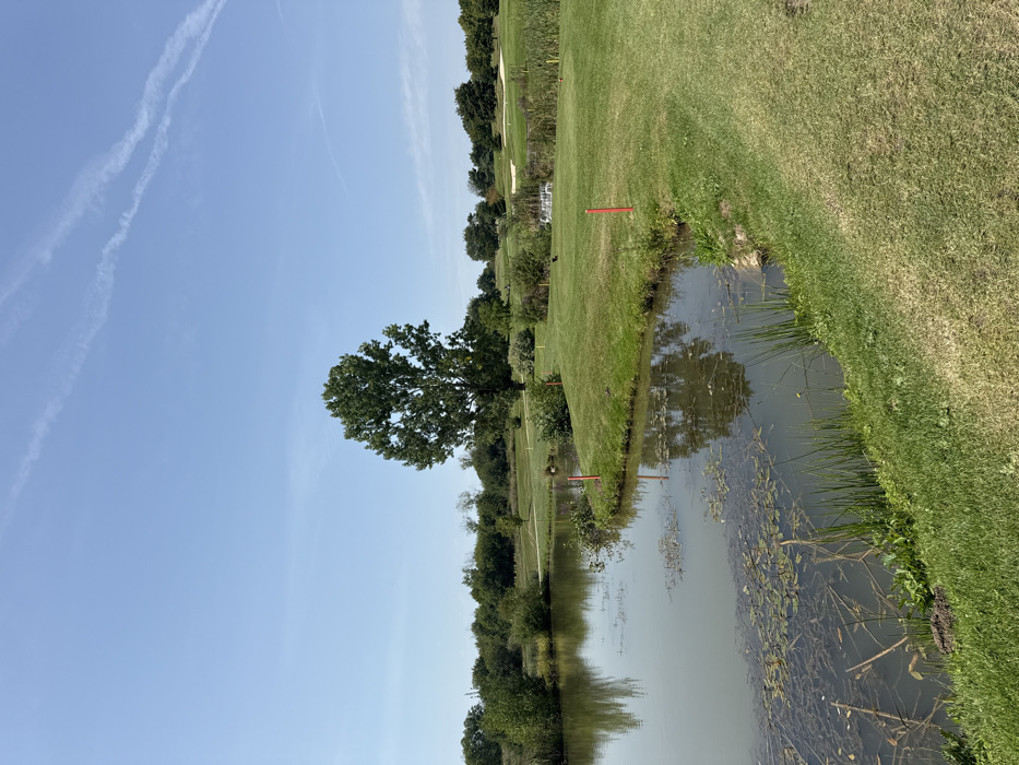 The image displays an outdoor scene at the Kikuoka Country Club (Golf de Luxembourg Kikuoka) in Canach, Lenningen, Luxembourg. The foreground features a calm, dark-toned pond, partially covered with submerged aquatic vegetation and reflecting a large deciduous tree. A manicured green grass area, consistent with a golf course teeing ground, occupies the right mid-ground and extends across the pond. This area includes two red tee markers. Beyond these markers, a small artificial waterfall cascades into the pond. In the background, rolling green fairways, scattered trees, and a distant sand bunker are visible. The sky is clear blue with two prominent white contrails diagonally traversing the upper right quadrant. No people or active interactions are visible; the scene is static. A small dark bird or object is present on the grass near the waterfall structure.