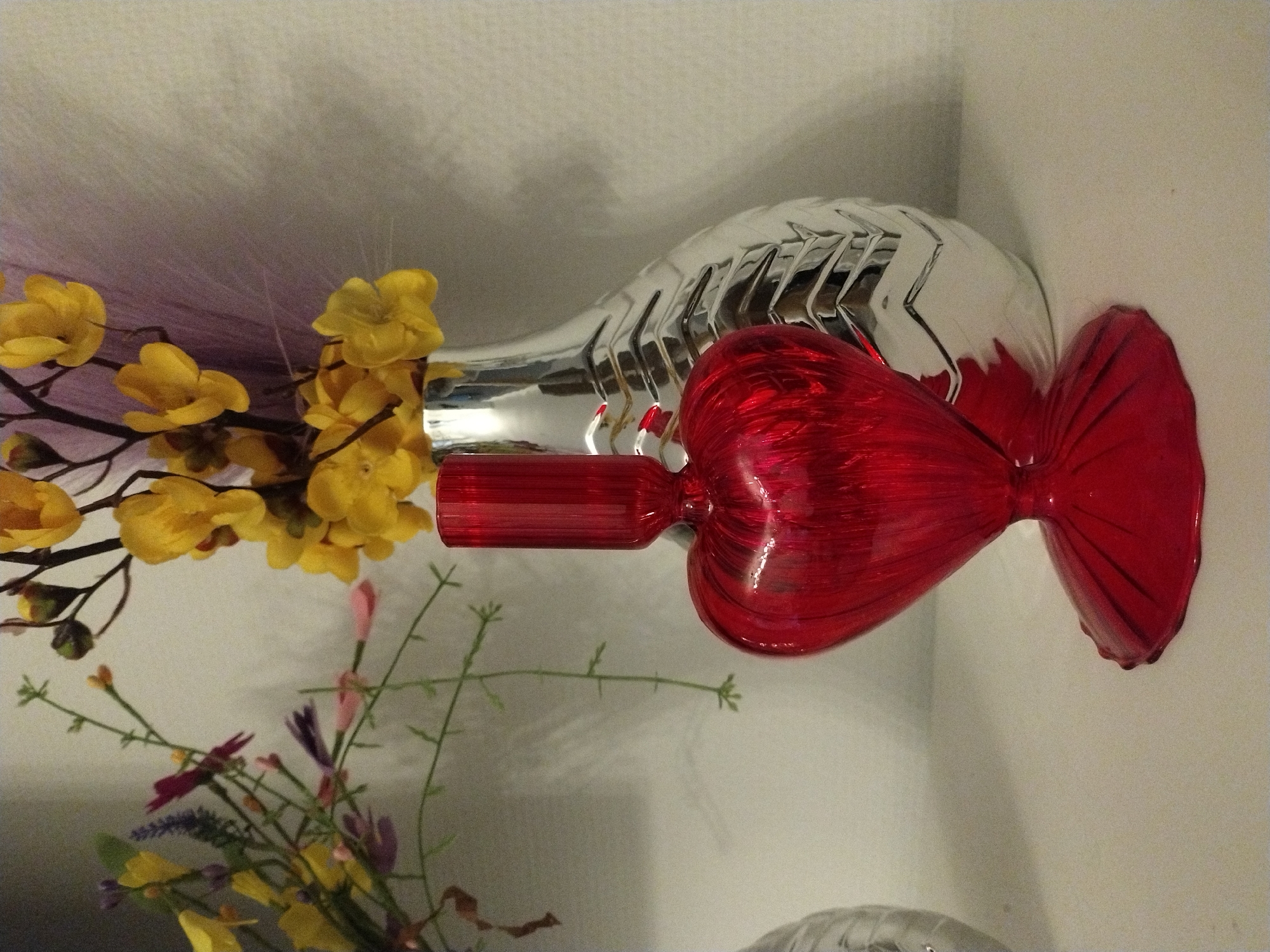 The image captures a still life arrangement located in Crauthem, Luxembourg. A prominent translucent red heart-shaped candle holder, featuring vertical ridging on its body and a fluted base, occupies the central foreground. Behind and to the right of the candle holder, a reflective silver vase with a textured chevron pattern contains a bouquet of artificial yellow flowers and purple/pink feathery decorative elements. On the far left, partially visible, another metallic vase holds an arrangement of artificial yellow, purple, and pink flowers with green stems. All objects are positioned on a light-colored, flat horizontal surface against a plain, light-colored wall, which displays subtle shadows cast by the arrangement.