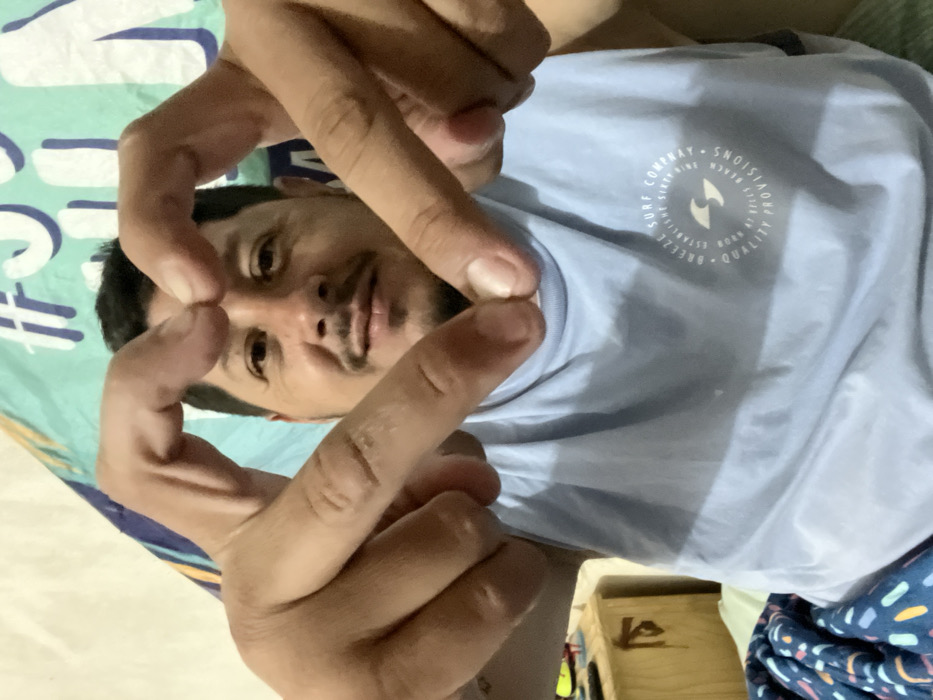 An adult male, approximately 30-45 years old, with dark hair, a mustache, and a light goatee, is depicted in a medium close-up, smiling faintly and looking directly at the camera. He is forming a heart shape with both hands, positioned in front of his face. He wears a light blue sleeveless shirt featuring a white circular logo on the chest that reads "BREEZE SURF COMPANY ESTABLISHED SIXTY-EIGHT BORN AT KEELYS BEACH QUALITY PROVISIONS" around a stylized 'S' or wave emblem. The background consists of a patterned turquoise and white fabric or tapestry behind his head. To the lower left, a dark blue patterned blanket is visible, and further left, a light-colored wooden nightstand with indistinct objects on top can be seen. The scene is an indoor setting in Bernal Este, Argentina.