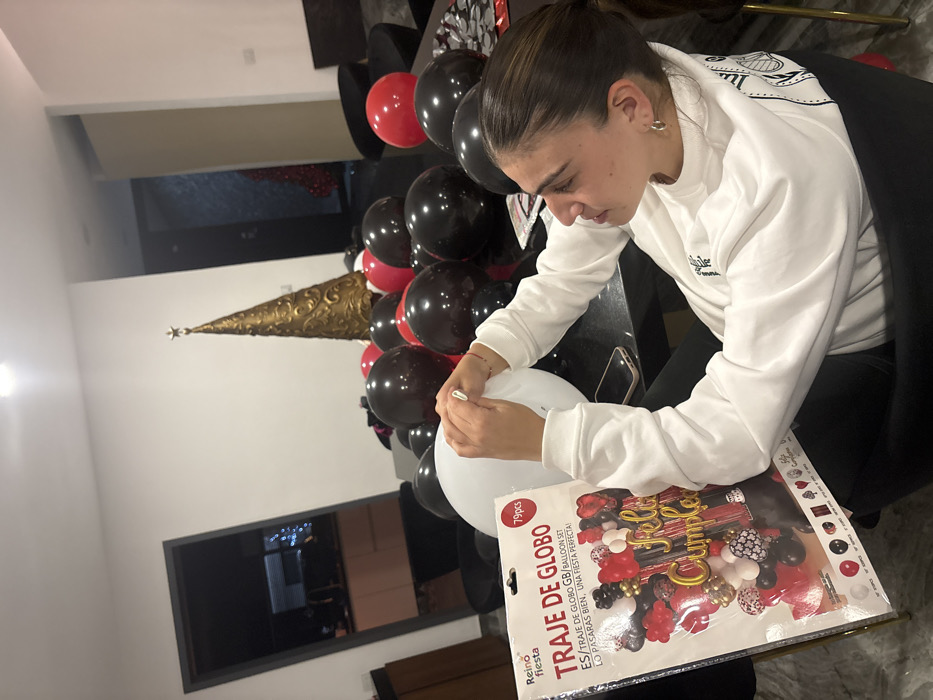 A woman in a white sweatshirt is assembling a balloon garland, attaching a white balloon using a white pen. The garland consists of black and red balloons, arranged around a golden, ornate cone-shaped object. A package labeled "TRAJE DE GLOBO," containing a 79-piece balloon set for a "Feliz Cumple" celebration, lies on the table next to her. The scene is indoors, with a dark background and a glimpse of a doorway or window reflecting light.