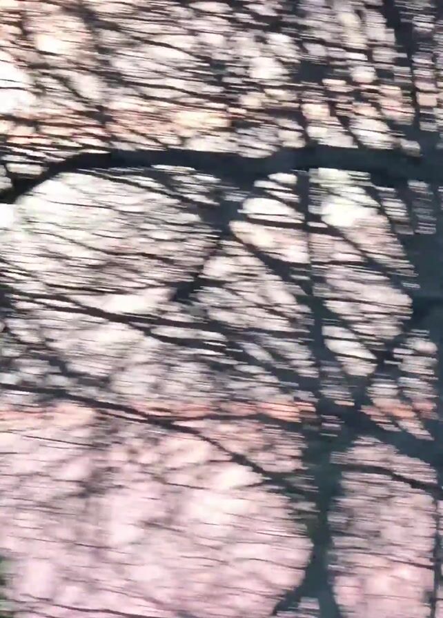 trees in winter, without leaves, against a cloudy, dawn-like sky. The branches are silhouetted in the foreground against a pale pink and white sky. Birds fly between the tree branches. The camera pans up and around, blurring the branches.