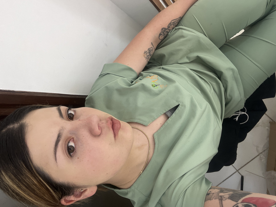 An indoor, upward-angled selfie captures a female subject, appearing to be in her twenties or thirties, with medium-fair skin, dark brown hair pulled back, and brown eyes. She has a silver stud piercing in her left earlobe and wears a gold-colored chain necklace. Her lips are slightly pursed. She is dressed in a light sage green medical scrub uniform, comprising a short-sleeved V-neck top with a grey undershirt visible underneath, and matching pants. The right chest of the scrub top features an embroidered logo depicting a stylized green snake with yellow outlines, accompanied by yellow letters. Tattoos are visible on both forearms: the right forearm displays an anatomical heart tattoo higher up and another larger figurative tattoo below it; the left forearm shows a partially visible tattoo near the wrist. The background consists of a plain white wall on the right and a dark brown wooden door frame on the left. The floor, visible in the lower left, is covered with light-colored square tiles. A black object, possibly a bag, with white wired headphones, and a partial cardboard box are situated on the tiled floor. The scene is illuminated by ambient interior lighting. While indicated to be in La Paz, Bolivia, no specific visual elements within the image directly identify this city or a particular location within it. The setting is consistent with a private or professional indoor environment.