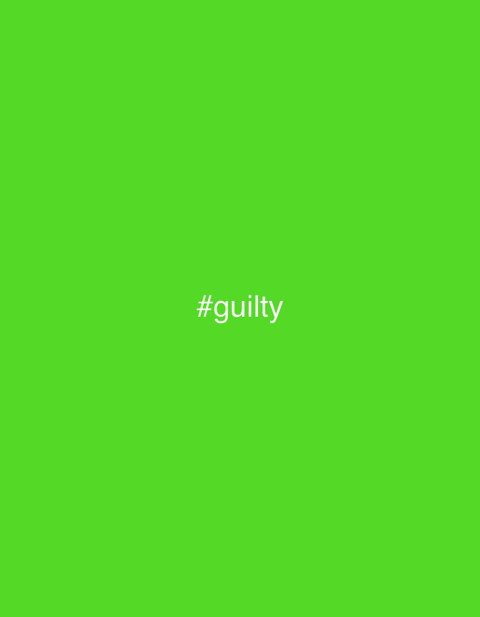The image displays a solid, uniform lime green background. Centered horizontally and slightly above the vertical midpoint, the white text "#guilty" is present in a sans-serif font. No individuals, objects, specific actions, interactions, or environmental features are depicted within the image. The scene is entirely abstract. This image is associated with the city of Fiumicino, Italy.