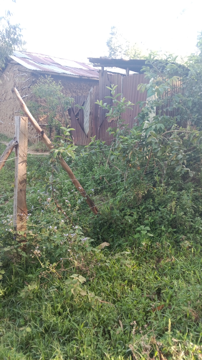 A dilapidated scene presents a weathered house with a rusty, corrugated iron roof. Mud walls are visible, hinting at simple construction. Overgrown vegetation fills the foreground, obscuring a barbed wire fence supported by wooden posts. The fence runs diagonally across the frame, adding a sense of enclosure. The overall impression is one of rural decay and abandonment.