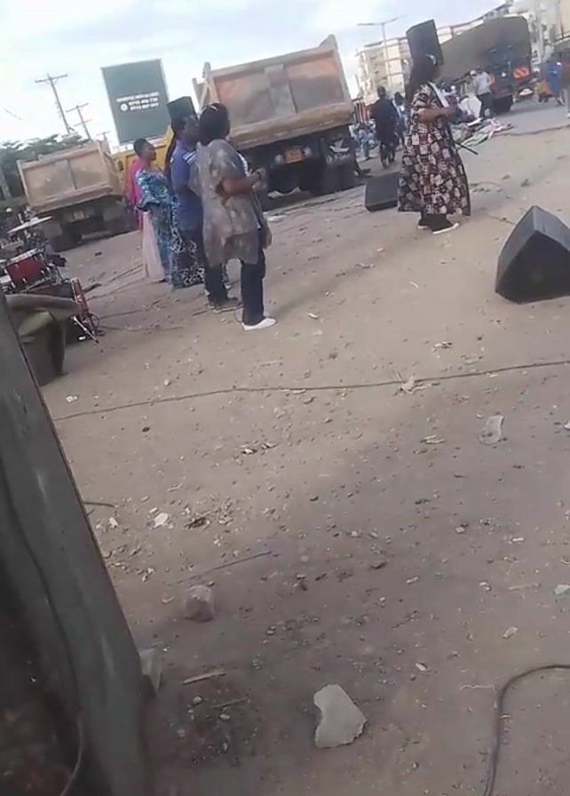 dusty, open area in an urban environment. A group of people stand together near a drum set, dump trucks, and sound equipment. Another individual is standing near a speaker. Other people can be seen moving about in the background. The area has some litter scattered across the ground. In the background, buildings and vehicles can be seen, along with utility poles and streetlights. Two individuals wearing yellow safety vests stand in the road.
