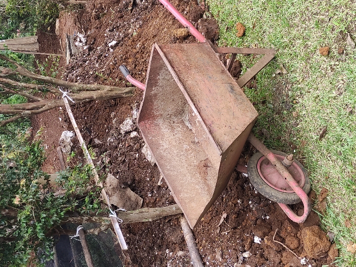 An overturned, rusty wheelbarrow rests on dirt and grass. The wheelbarrow is red and appears well-used. Dirt is piled up around it, with some white chunks mixed in. Adjacent to the dirt is a section of green grass. A small tree or bush is visible to the left, supported by a wooden stake and string. The ground around the vegetation is also dirt, suggesting recent landscaping work.
