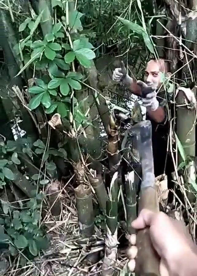 person in a dense, overgrown area of bamboo. The person holding the camera is filming from a first-person perspective. In the background, another individual, wearing a black shirt and white gloves, is using a large blade or machete to cut bamboo shoots. The location appears to be a bamboo forest or thicket with lush green foliage. The lighting is somewhat subdued, suggesting it's either overcast or the area is heavily shaded by the bamboo canopy.