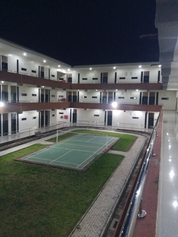 The image displays an interior courtyard of a multi-story building at night in the city of Unknown, Unknown. The structure, observed from an elevated perspective, forms a U-shape around a central green space. Each of the three visible floors features an external corridor lined with dark doors set against white walls, illuminated by recessed ceiling lights. Brown fascias and railings define the edge of each floor's walkway. In the courtyard's center lies a rectangular green sports court, marked with white lines and equipped with a white net and posts, consistent with a badminton court. This court is bordered by neatly manicured green grass, which is further framed by light gray interlocking brick pathways. A dark-colored gutter or trench runs along the base of the building perimeter. The foreground shows a section of a polished light-colored floor with stainless steel railings. The sky above is dark, indicating a nighttime setting. No individuals or active subjects are present within the scene.