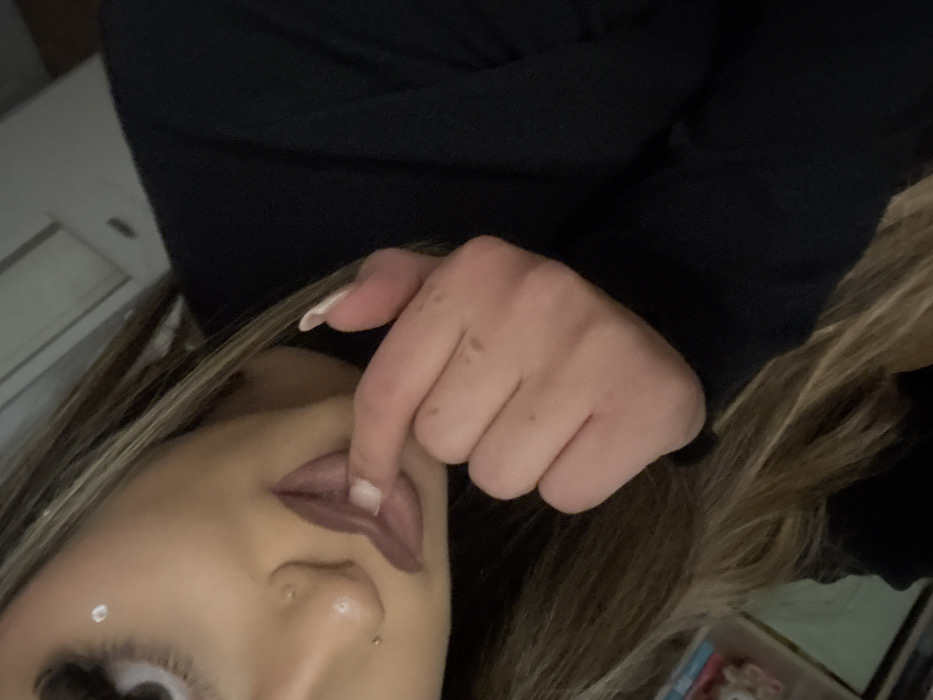A woman's face is angled towards the camera. She has light brown hair and is wearing black clothing. Her right hand is visible, with a finger inside her mouth, pulling down her bottom lip. Her lips are mauve colored. She has a nose piercing on the right side, and a small white sticker or bead on her forehead near her left eyebrow. Her eyes are visible with black eyeliner.