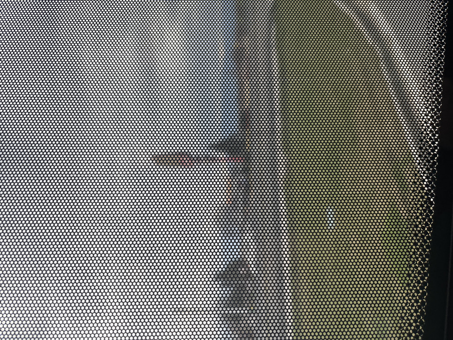 The image displays an outdoor scene observed through a perforated screen, which creates a pixellated visual effect