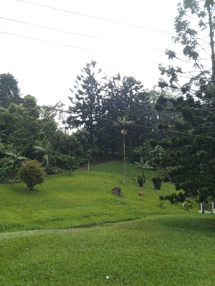 A sloping green lawn ascends to a line of trees. The foliage varies from short, rounded bushes to tall palms and evergreens. Powerlines stretch across the top of the frame against a pale sky. A dark rock sits on the grass slope. The right edge of the frame shows a glimpse of a white fence.