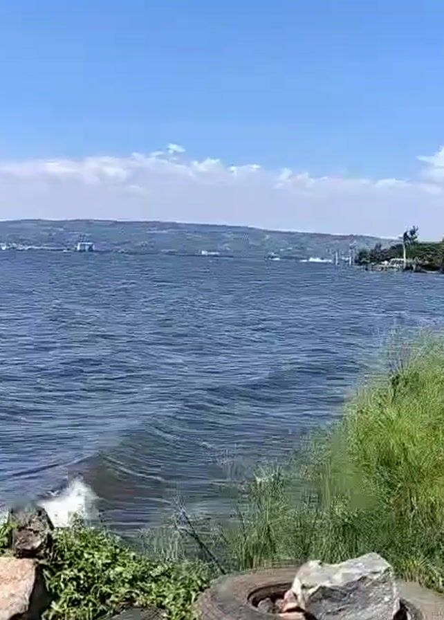 The video depicts a wide body of water, possibly a lake or a sea, with gentle waves rippling across its surface under a partly cloudy, blue sky. In the distance, a low-lying landmass is visible. The foreground is characterized by lush green vegetation and what appears to be a tire. The camera pans from left to right. On the far side of the water, there is vegetation and structures that look like buildings. The video ends with a view of the water and vegetation.