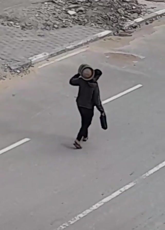 A person walks on a paved surface, with white lines indicating a lane. They are carrying a round object on their shoulders and something dark in their hand. There is some debris to the side of the paved area.