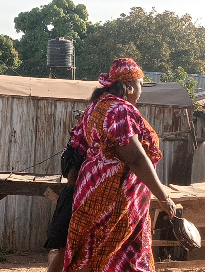 A woman in an orange and pink patterned dress with a matching headscarf walks past wooden structures. She holds a small black and silver container in her right hand. Another person stands nearby, obscured by the woman in the patterned dress. A black water tank sits atop a corrugated metal building, framed by lush green trees. The setting appears to be a rural or developing area.
