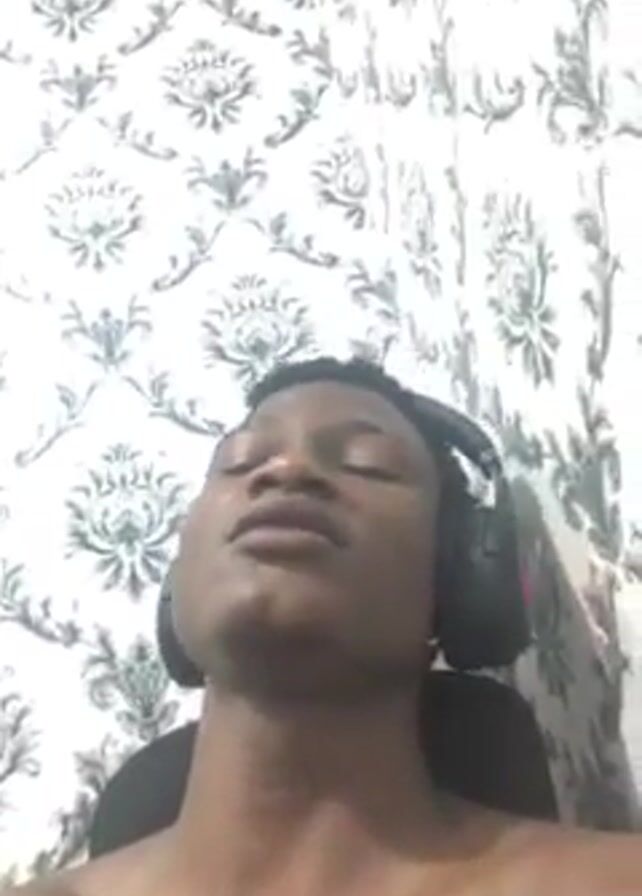 A dark-skinned person wearing headphones is singing. The person is topless and seated in front of a white and gray floral patterned wall. The camera is pointed up toward the person's face. They move their head and mouth as they sing.