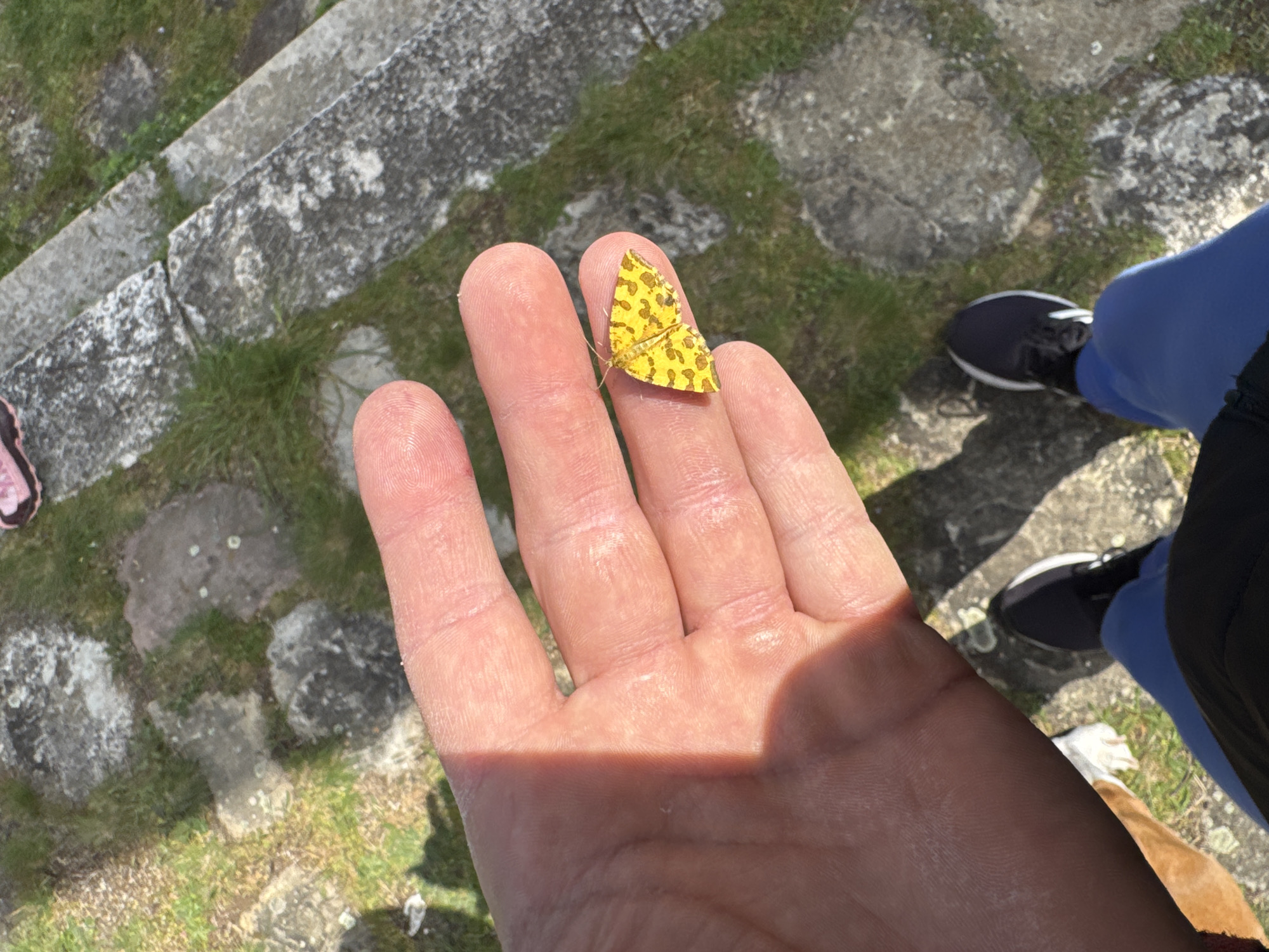 A hand with a yellow butterfly on a finger is positioned outdoors. The butterfly is small and has brown spots. The hand belongs to a person wearing blue leggings and black sneakers. The surroundings consist of stone steps, grass, and other vegetation. The location is Milanovo, Bulgaria.