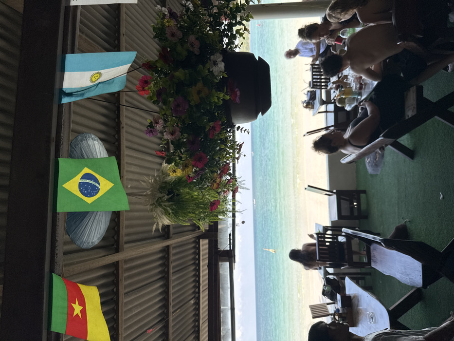 The image displays an open-air restaurant or bar in Baan Chaloklum, Thailand, situated directly on a sandy beach overlooking the turquoise waters of the Gulf of Thailand. The establishment features a corrugated metal roof supported by dark wooden beams. Suspended from the ceiling are three national flags: Cameroon (green, red, yellow with a star), Brazil (green with a yellow diamond and blue sphere), and Argentina (light blue and white stripes with a sun emblem). Multiple hanging baskets containing green foliage and various colorful flowers are also present. The floor is covered with a green, synthetic turf-like material. Numerous dark wooden tables and chairs are arranged throughout the space. In the foreground-left, a male with dark hair wearing a light-colored shirt is partially visible, facing right, positioned near a wooden table with an ashtray and a wooden bench. Further back on the left, a person with long dark hair is seated with their back to the viewer at a table next to a black backpack, facing the ocean. On the right side, a group of four individuals is gathered around a table laden with drinks and bottles. This group includes a woman in a dark top, a shirtless male, and two other women. In the mid-background-right, a bald male in a white t-shirt is seated alone at a separate table. A small, dark-colored animal is discernible beneath one of the tables. The background shows a narrow expanse of sandy beach meeting the ocean, which transitions from light blue-green closer to shore to a deeper blue further out. A yellow, triangular object protrudes from the water, and several boats are visible in the distance. The scene is illuminated by natural daylight under a clear, bright sky.