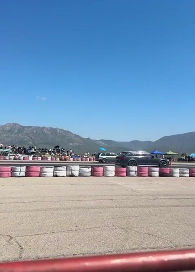 two dark-colored station wagons racing on a paved track on a sunny day. The camera is stationary behind a red barrier, focusing on the cars as they accelerate away from the starting line. The background features a line of spectators, tents, and mountains under a clear blue sky. The track is bordered by a row of tires painted pink and white.