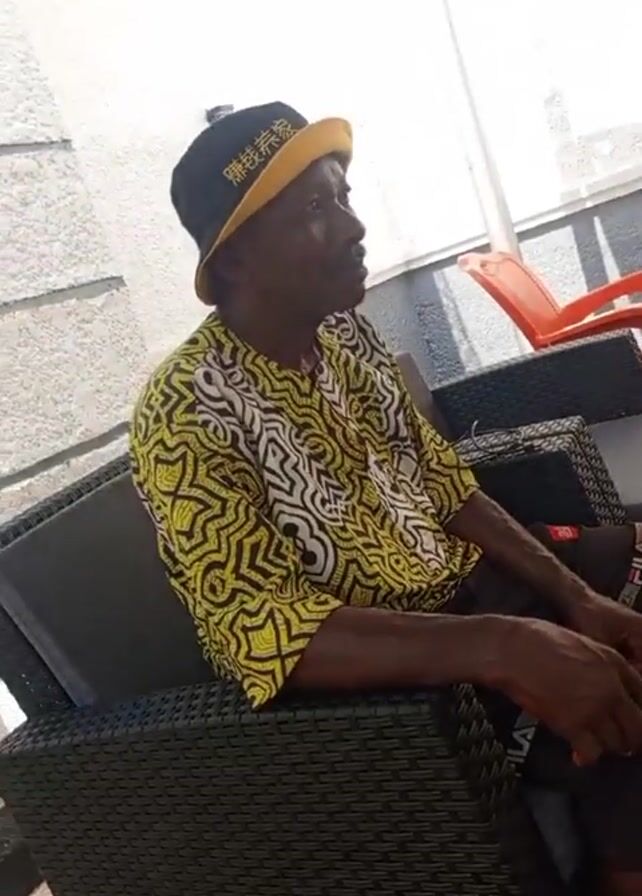 n elderly man sitting on an outdoor wicker sofa. He is wearing a patterned yellow and black shirt, black shorts, and a black bucket hat with a yellow brim. The hat has text in a non-English language. He is looking off to the side and appears to be talking. In the background, there is a white wall, an orange chair, and another wicker sofa. The scene is well-lit.