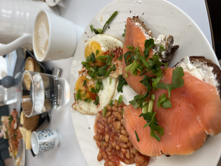 The image depicts a breakfast meal set on a white table, presumably within a dining establishment in Gangloff, Germany. In the foreground, a white circular plate holds an assortment of food: a serving of baked beans in tomato sauce, two fried eggs garnished with chopped chives and a reddish spice, and two slices of dark bread spread with a white creamy substance and layered with smoked salmon, topped with fresh parsley and chives. One of the salmon-topped bread slices exhibits a bite mark. In the midground, a clear glass containing water, a white cup with a latte displaying heart-shaped latte art, and a small white ceramic cup with a blue floral pattern are visible. A white ceramic pitcher is positioned behind the latte cup. Blurred elements in the background include indistinct items on a dark tray, possibly bread and cheese, and a blurred hand or arm suggesting the presence of an individual. The environment is an indoor setting with a predominantly light, minimalist aesthetic.