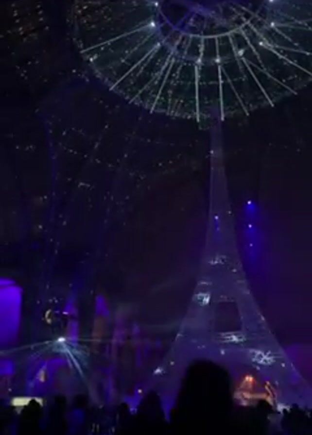 The video captures a nighttime scene within a large dome-shaped building, likely an exhibition hall or event space. The prominent feature is a replica of the Eiffel Tower illuminated in blue light, positioned in the center. Above, a circular structure, possibly a lighting rig, emits white lights downwards, resembling stars. People are milling around in the foreground, suggesting an event is taking place. The lighting is dramatic, with a combination of spotlights and ambient blue hues creating a dynamic atmosphere.