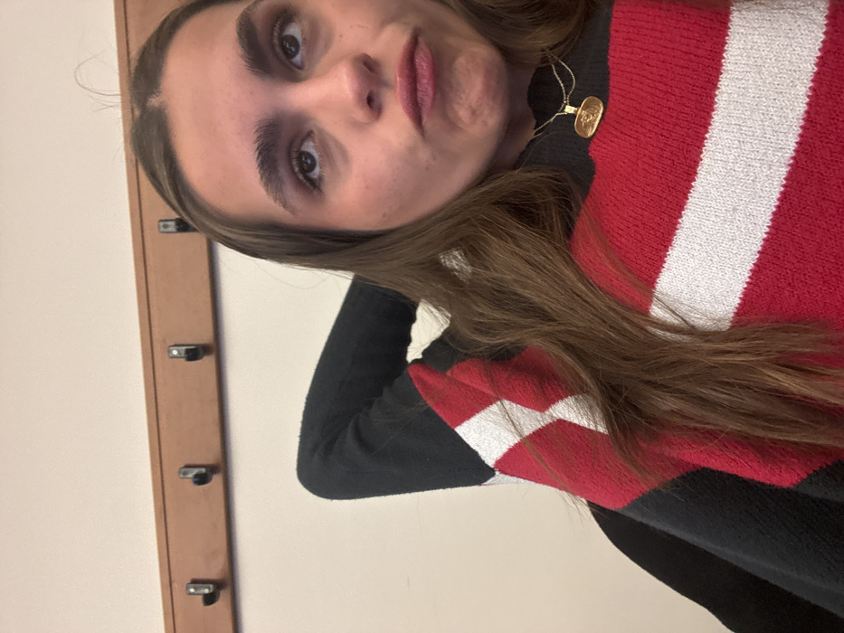 A woman with light skin, light brown hair, and dark eyebrows poses for a selfie. She wears a black long-sleeved shirt under a sweater with red, white, and black geometric patterns. A gold necklace with a pendant is visible. A brown wooden frame with metal hooks runs vertically along the left edge. The background is a plain, light-colored wall.