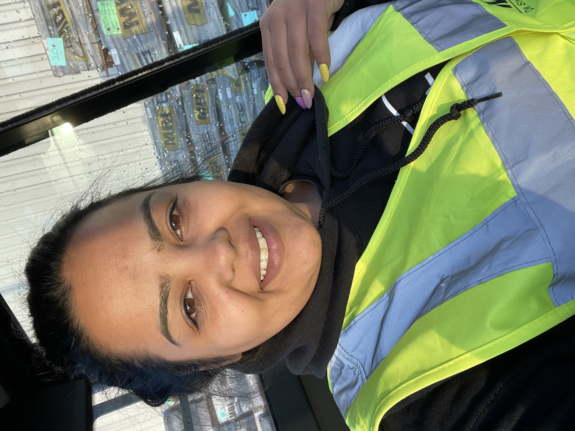A woman smiles at the camera while wearing a black hooded sweatshirt and a high-visibility yellow and silver reflective vest. She is inside a vehicle with a rain-covered window behind her, showing stacks of packaged materials labeled "MBI". There appear to be handwritten notes on some of the packages. Her fingernails are painted yellow and purple. The city of Kampen, Netherlands cannot be confirmed from the image.