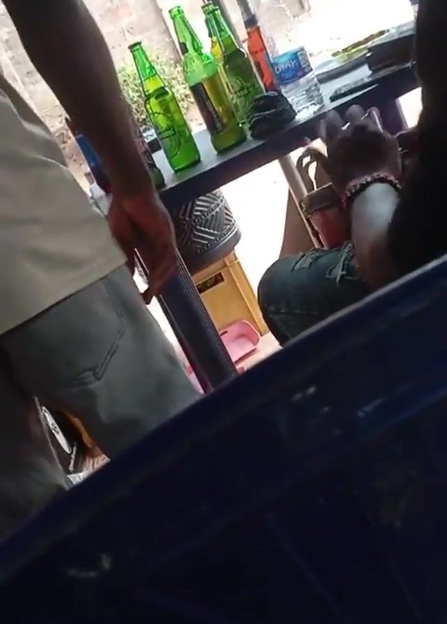 From a low-angle perspective, the video shows a man standing near a table with bottles of beer and soda. The table is black with metal legs, and there are several green beer bottles, a bottle of Pepsi, and other bottles on top. The man is wearing a light-colored shirt and grey pants. Another person is seated at the table, visible from the side. The setting appears to be outdoors, possibly a casual gathering or a bar.