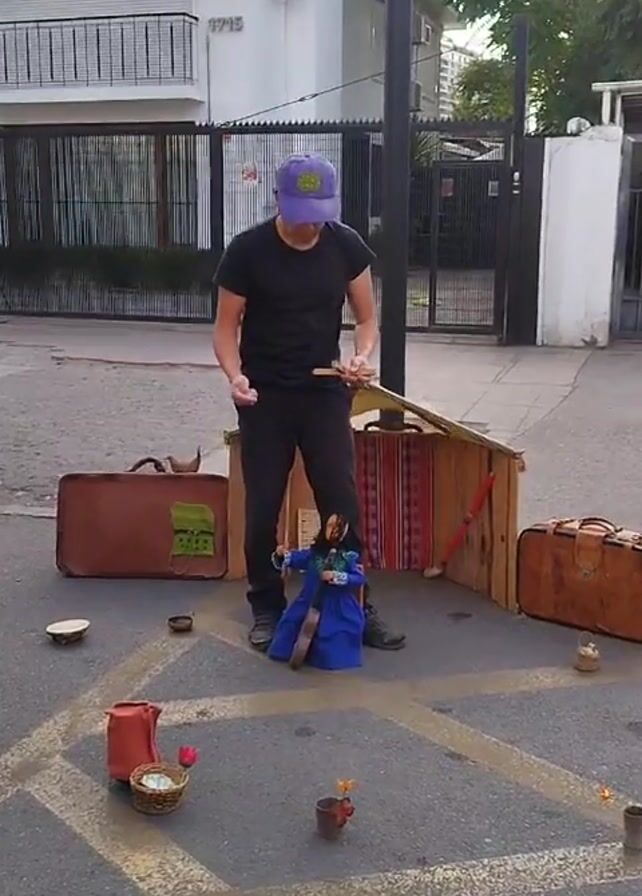 A man in a black shirt and pants and a purple baseball cap stands on a street manipulating a marionette doll dressed in blue. He stands in front of a small, wooden puppet theatre backdrop decorated with a colorful, striped fabric. Two brown suitcases, a small ceramic bowl, and a small, brown pot containing flowers surround him and the puppet theatre. The scene is set on a paved street in front of a white building with a black wrought iron fence. Sounds of applause and other general background noise are audible.