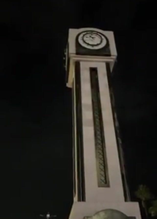 tall clock tower at night. The tower is made of light-colored stone and has a clock face at the top. A narrow, vertical window runs down the center of the tower. At the base of the tower, there is an arched opening. There are people standing near the base of the tower. Street lights are visible in the background. The night sky is dark, with a few clouds.