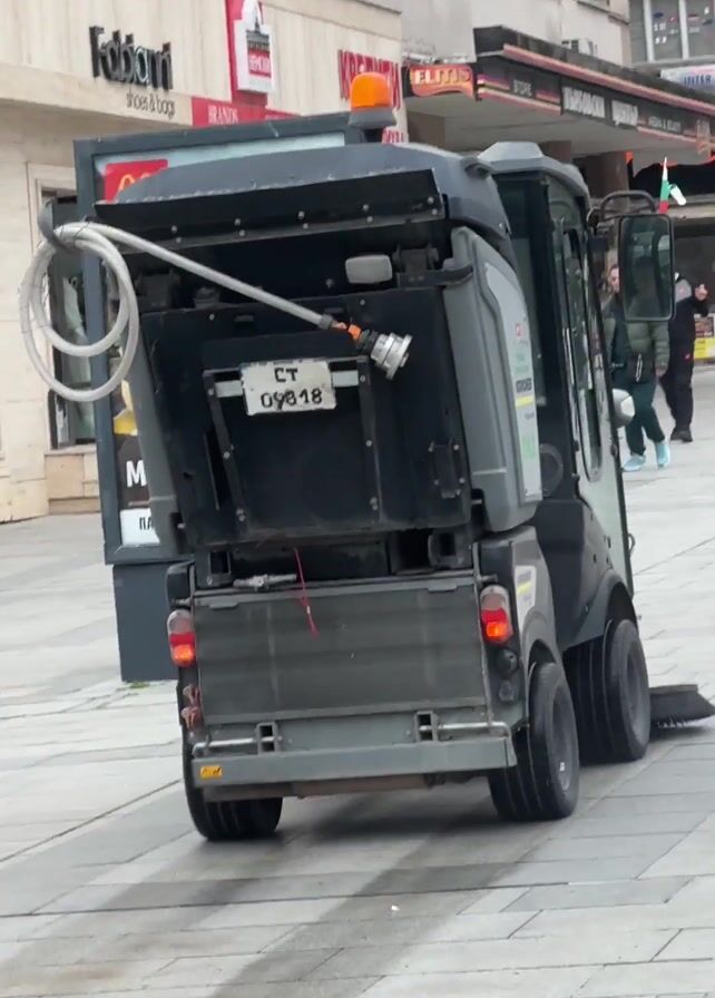 A small, dark gray street sweeper drives on a paved pedestrian walkway. The rear of the sweeper is visible, revealing a vacuum hose and a license plate with the number "CT 09818." Buildings line the street, hosting various shops and restaurants, including McDonald's and Fabiani shoes. Pedestrians walk in the distance. A single pigeon stands near the sweeper. The day appears overcast.