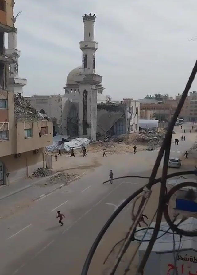 The video depicts a street scene in what appears to be a war-torn area. In the foreground, part of a building is visible with apparent damage. The street is relatively empty except for a few people, including several children who are seen walking and running along the road. Across the street is a mosque with a partially destroyed roof. Debris and rubble are scattered throughout the area. The sky is overcast.