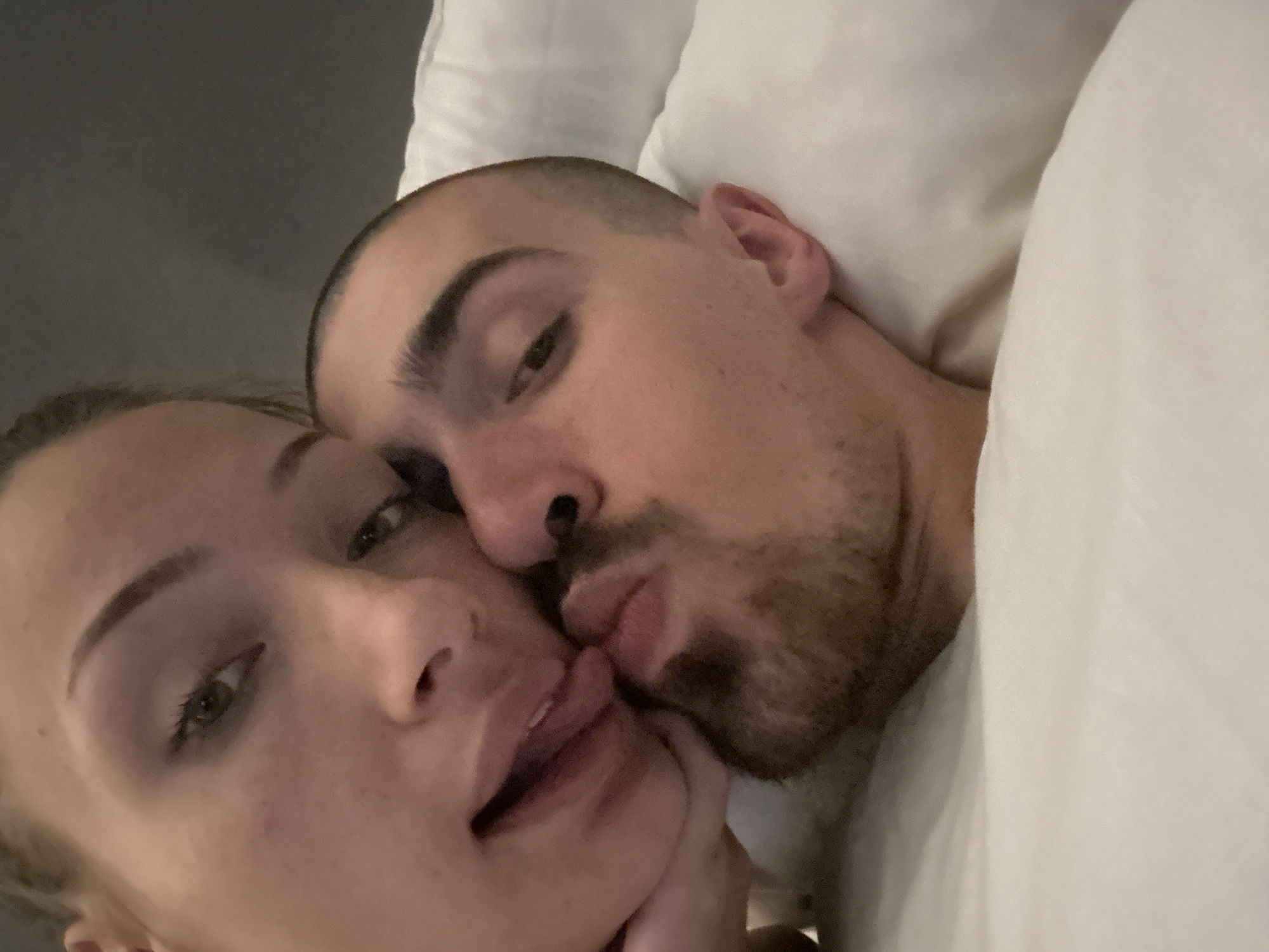 two individuals, a female and a male, in an intimate indoor setting, likely a bedroom, in Varna, Bulgaria. The female, positioned on the left, presents a partial view of her face with her left eye open and her tongue extended, making contact with the male's pursed lips. Her hair is light-colored and pulled back. The male, positioned on the right, has short dark hair and a short beard. His face is angled towards the female, and his right eye is partially closed as his lips are pursed in a kissing gesture. Both individuals are resting on white bedding, with a plain dark grey wall visible in the background.
