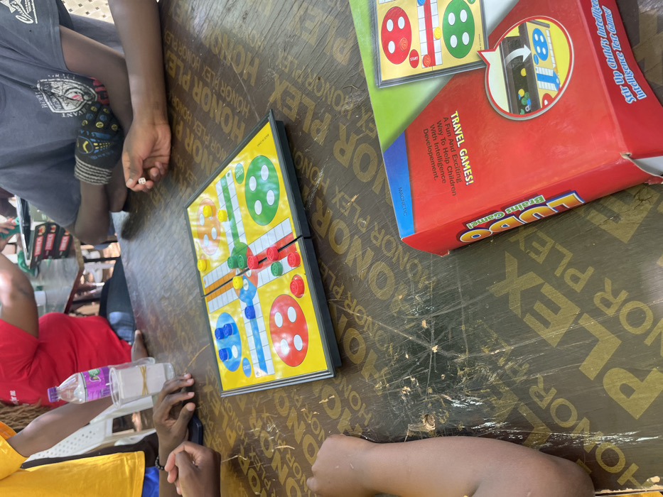 A group of people are gathered around a wooden table playing a game of Ludo. The game board is visible, with colorful game pieces arranged on it. Beside the board is the game's packaging box, which describes it as a "Travel Game" and "Brain Game" aimed at children's intelligence development. A water bottle, held together with rubber bands, is also present on the table, indicating a casual setting. The table is covered with imprinted labels and patterns of the words "HONOR" and "PLEX" in a repeating design.