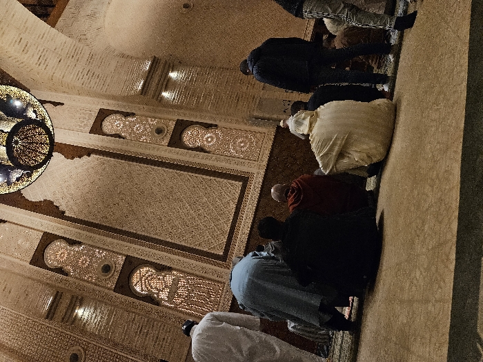 Several people are lined up indoors, likely praying in a mosque