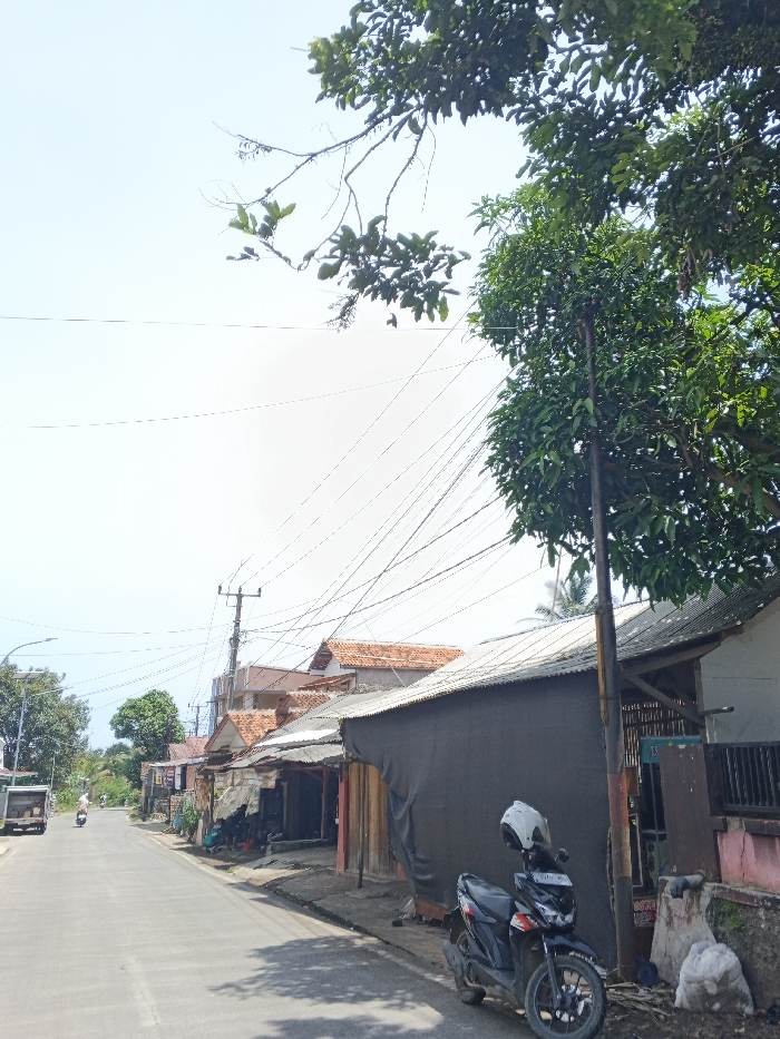 A street scene with a parked black and red scooter near a building covered with a black tarp. Several other buildings line the street, some with red tile roofs. Power lines crisscross the sky above. Green trees partially frame the image, with a large tree on the right and branches extending from the top left. A few vehicles and a person on a motorbike are visible in the distance.